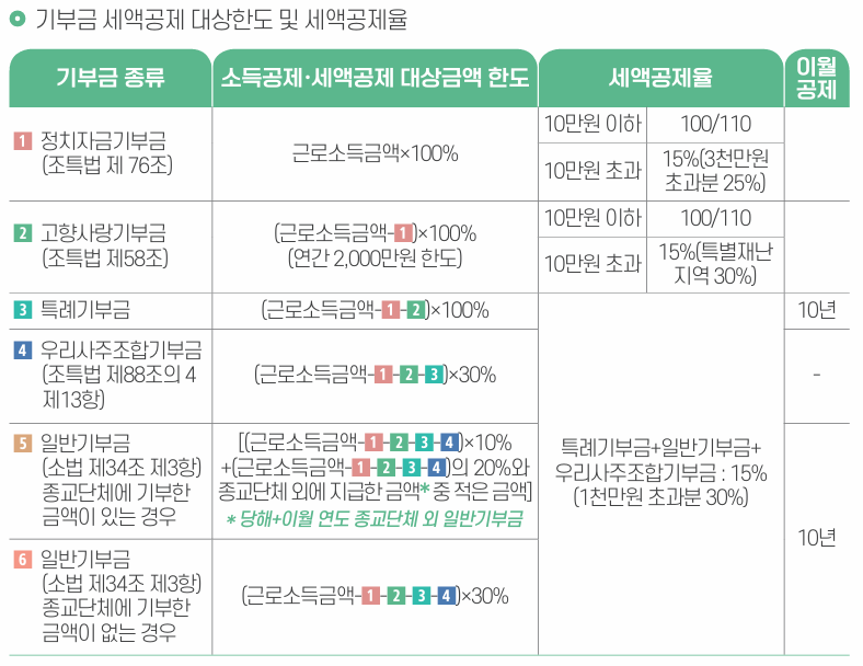 3. 기부금 공제 적용 순서: 세액공제는 다음 순서에 따라 적용됩니다. 정치자금기부금 → 고향사랑기부금 → 특례기부금 → 우리사주조합기부금 → 일반기부금(종교단체 외) → 일반기부금(종교단체)